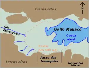 À época da batalha, o desfiladeiro das Termópilas consistia em uma passagem ao longo da costa do Golfo de Mália tão estreito que dois carros não podiam atravessá-lo ao mesmo tempo.[49] Limitado ao sul por falésias de grande porte, enquanto a norte se encontrava o Golfo de Mália. Ao longo do caminho, havia três passagens estreitas ou "portas" (pylai) e na porta central foi erguida um muralha que havia sido construída pelos focidios no século anterior para se defender contra invasões provenientes da Tessália.[49] O lugar recebeu o nome de "Portões Quentes" devido as fontes de águas quentes que se podiam encontrar nesse lugar.[38]