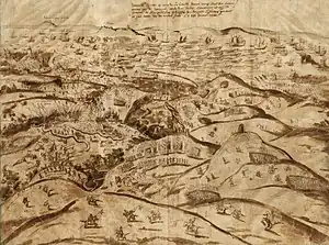 | “ | Sabendo o duque de Alba por espias e ruins portugueses, como grande parte da gente da cidade se recolhia a ela a dormir em suas casas, acometeu de súbito o arraial do Senhor D. António trabalhando de entrar pela ponte de Alcântara, assim para lhe inquietar a gente, como ganhar naquela revolta contra os moinhos de vento, um outeiro que ficava sobranceiro ao arraial do inimigo e colocou nele a sua artilharia.
