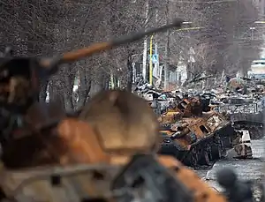 Em 1º de março, fotos de equipamentos russos destruídos e abandonados começaram a circular pela mídia ucraniana, com alguns descrevendo Bucha como "um cemitério para os equipamentos russos destruídos".[24][25][26][27]
