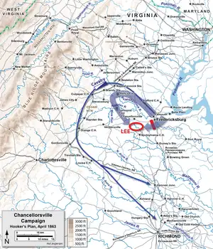 A Campanha de Chancellorsville começou com a travessia do rio Rappahannock pelo Exército da União na manhã do dia 27 de abril de 1863. Quase ao mesmo tempo, a cavalaria da União sob o comando do major-general George Stoneman iniciou um ataque contra as linhas de abastecimento de Lee. Esta operação foi totalmente ineficaz. Atravessando o rio Rapidan via Germanna e Ely's Fords, a infantaria federal concentrou-se perto de Chancellorsville em 30 de abril. Juntamente com a força da União posicionada em Fredericksburg, Hooker planejou um duplo envolvimento, atacando Lee pela frente e retaguarda, simultaneamente.
