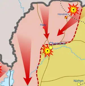 Em 25 de março, as autoridades ucranianas disseram na sexta-feira que as forças russas cortaram a cidade de Chernihiv, no norte, depois de destruir uma ponte no sul,[23] enquanto as tentativas do exército russo de cercar totalmente a cidade não tiveram sucesso.[24]