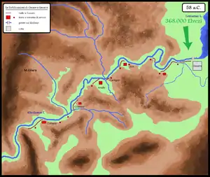 Migrando em massa, os helvécios queimaram propriedades e colheitas que não conseguiam levar consigo, convenceram os ráuracos, tulingos e latóbrigos a se unirem a eles e ainda receberam os boios que vinham de Noreia[2]. Este enorme multidão humana chegou ao Ródano em 28 de março e ali seus líderes discutiram qual seria o caminho a seguir: a primeira opção era avançar pelo território dos sequanos (aliados de Roma) e a segunda, pelo dos alóbroges (conquistados por Roma). A decisão foi pela segunda[1]. Quando soube da invasão, César mobilizou a Legio X e, com marchas forçadas, os romanos chegaram em Genava em 2 de abril com o objetivo de dificultar a travessia do rio[3]. De Aquileia vinham também outras três legiões, a VII, VIII e a IX. Em Narbona mais duas estavam em treinamento (XI e XII).[carece de fontes]