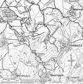 ![]() Linhas defensivas alemãs, nas proximidades de Delville Wood, Guillemont, Maurepas, Morval (julho a setembro de 1916). | |||