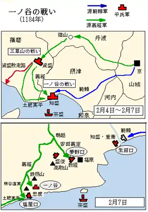 Minamoto no Yoshitsune, Minamoto no Noriyori e o sohei (monge-guerreiro) Saitō no Musashibō Benkei foram convocados para combater o Clã Taira nas províncias ocidentais em 13 de março de 1184 chegam no Mar Interior de Seto na Fortaleza de Ichi-no-Tani, uma importante fortaleza costeira dominada pelos Taira na Província de Harima, ao oeste da atual Kōbe [1] ; este lugar era para onde as forças Taira se retiraram quando Minamoto no Yoshinaka os expulsou de Kyoto no ano anterior. A Fortaleza de Ichi-no-Tani era reforçada com dois pequenos fortes, Mikusuyama, ao norte e Ikuta no Mori a oeste e a parte traseira da fortaleza estava protegida por uma elevação; para poder atacar Ichi-no-Tani, primeiro era preciso atacar os fortes que a rodeavam.