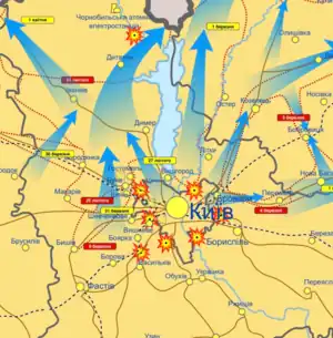 Na manhã de 25 de fevereiro, as forças ucranianas destruíram a ponte em Ivankiv que atravessava o rio Teteriv, interrompendo o avanço de uma divisão de tanques russos em direção a Kiev. Tropas de assalto aerotransportadas ucranianas enfrentaram soldados russos em Ivankiv e na cidade vizinha de Dymer.[1][2]