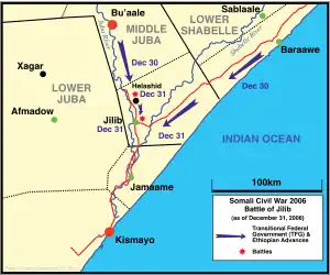 No sábado, 30 de dezembro, as tropas conjuntas da Etiópia e do Governo de Transição da Somália chegaram à cidade de Jilib, a última grande cidade na estrada para Kismayo. O xeque Sharif Sheikh Ahmed pediu a seus soldados para que lutassem.[6][7]