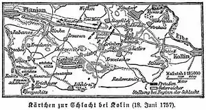 Na Batalha de Kolin, travada a 18 de Junho de 1757 viu 44 mil austríacos sob o Conde von Daun derrotar Frederico, o Grande durante a Terceira Guerra da Silésia (Guerra dos Sete Anos) que tinha sob seu comando 32 mil prussianos. Os prussianos perderam 14 mil homens, enquanto os austríacos perderam 8 mil homens.