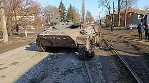 ![]() Um blindado 9K114 Shturm russo destruído na cidade. | |||