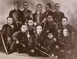 Tosa Jinshotai (迅衝隊) (Da esquerda na linha inferior: Ban Gondayu, Itagaki Taisuke, Tani Otoi (jovem rapaz), Yamachi Motoharu. Da esquerda na linha do meio: Tani Shigeki (Sinbei), Tani Tateki (Moribe), Yamada Kiyokado (Heizaemon), Yoshimoto Sukekatsu (Heinosuke). Da esquerda na linha superior: Kataoka Masumitsu (Kenkichi), Manabe Masayoshi (Kaisaku), Nishiyama Sakae, Kitamura Shigeyori (Chobei), Beppu Hikokuro.)
