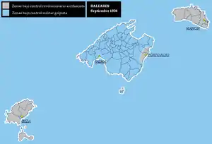![]() Mapa mostrando a altura da ofensiva nas Baleares, com Minorca, Ibiza, Formentera, Cabrera e leste de Maiorca tudo sob controle republicano (em cinza). | |||