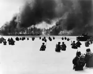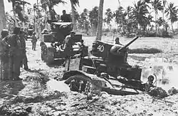 ![]() Tropas americanas do 2º Batalhão, 165ª de Infantaria, lutam para tomar a Praia Amarela na Ilha de Butaritari | |||