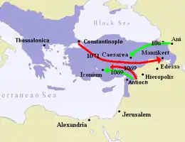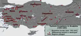 | “ | ... a sorte do Império Romano afundou-se na sua maré mais baixa. Pois os exércitos do Oriente foram dispersados em todas as direções, porque os turcos se tinham espalhado excessivamente e tomado o comando de países entre o Mar Euxino, o Helesponto, o Mar Egeu, os Mares Sírios (Mediterrâneo Oriental) e várias baías, especialmente aquelas que banham a Panfília e a Cilícia e se despejam no Mar Egípcio (Mediterrâneo). | ” |