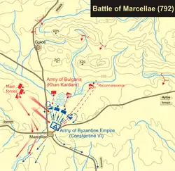 Devido ao terreno acidentado, o exército bizantino quebrou a formação. Tomando vantagem deste erro, Cardamo ordenou um contra-ataque que trouxe aos búlgaros um grande sucesso. A cavalaria búlgara circundou os bizantinos e cortou seu caminho de volta ao seu acampamento fortificado e a fortaleza de Marcela.[5] Os búlgaros pegaram os suprimentos, o tesouro e a tenda do imperador. Eles perseguiram Constantino VI para Constantinopla matando um grande número de solados. Muitos comandantes bizantinos e oficiais pereceram na batalha.[6]