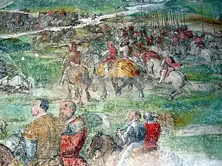 - Do outro lado estava um exército de 13 000 soldados a serviço de Florença, aliado a Galeazzo Maria Sforza (governante do Ducado de Milão), o rei Fernando II de Aragão e Giovanni II Bentivoglio (governante de Bolonha). O exército era liderado por Federico da Montefeltro.[1][2][3]