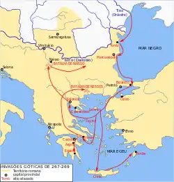 Neste ínterim, uma segunda invasão naval, muito maior, começou. Uma enorme coalização de "citas" - na verdade eram godos (grutungos e tervíngios), gépidas e peucinos, liderada novamente pelos hérulos - se reuniu na foz do rio Tiras[16]. A História Augusta e Zósimo relatam entre 2 000 e 6 000 navios e mais de 325 000 homens[17]. Estes números são provavelmente um grande exagero, mas são bons indicativos de que se tratou de uma grande invasão. Depois de não conseguirem tomar algumas cidades nas costas ocidentais do Mar Negro e do Danúbio (Tomi e Marcianópolis), os invasores atacaram Bizâncio e Crisópolis[18]. Parte da frota acabou naufragando, seja pela inexperiência dos marinheiros godos nas violentas correntes do Propôntida (o Mar de Mármara)[19] ou por que ela foi derrotada pela marinha romana. Os invasores então partiram para o Mar Egeu e um destacamento arrasou as ilhas chegando até Creta e Rodes. A força principal construiu armas de cerco e estava perto de conquistar Tessalônica e Cassandreia, quando foi forçada a recuar para o interior dos Bálcãs quando chegaram notícias que o imperador avançava à frente de um grande exército. No caminho, eles saquearam Dobero (Peônia?) e Pelagônia.