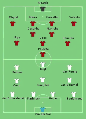“Cristiano Ronaldo precisou ser substituído por não aguentar a dor na coxa depois de uma entrada violenta de Boulahrouz." "Figo levou uma pancada no rosto e os jogadores quase partiram para a briga na sequência. O mesmo Figo, que deu uma cabeçada em um holandês." "Em outro momento, Sneijder empurrou Petit com força e novamente por pouco não começou a pancadaria."[4]
