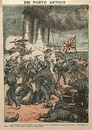 ![]() Gravura japonesa por Torajirō Kasai da frota japonesa atacando a frota russa na Batalha de Porto Artur | |||