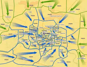 Até 1 de setembro, as FDS havia assegurado quase toda a Cidade Velha,[127][128] embora alguns enclaves do EIIL continuassem a resistir no beco al-Busariyah e na Grande Mesquita.[129] Essas forças do EIIL foram finalmente derrotadas com o apoio dos Boeing AH-64 Apaches americanos em 2 e 3 de setembro, fazendo com que toda a cidade velha estivesse sob o controle das FDS. As forças da coligação também avançaram para os bairros de Al-Morour e Daraiya,[129][130] que foram capturados até 6 de setembro.[131][132] Até 9 de setembro, o controlo do EIIL sobre Raqqa foi reduzido para cerca de 36%, principalmente para os bairros do norte de Al-Andalus, Shamal Sekket al-Qitar, al-Huriyah, Teshreen e al-Tawaso'eiyah. Além disso, enclaves do EIIL foram relatados pelo SOHR em nove bairros controlados principalmente pelas FDS.[133]
