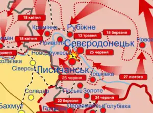 Em 25 de junho, as forças russas assumiram o controle de praticamente toda Severodonetsk[99] após os ucranianos se retirarem para posições militares mais defensáveis no oeste.[100] Uma semana mais tarde, a cidade vizinha de Lysychansk também caiu.[101]
