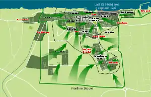 ![]() Mapa dos avanços do Governo do Acordo Nacional em Sirte de 16 de junho a 6 de dezembro de 2016 | |||