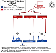 Após uma breve parada para deixar o trem de bagagem atrás e formar uma linha de batalha o exército persa rapidamente avançou sobre os bizantinos, atirando flechas enquanto se aproximavam. Os bizantinos responderam na mesma moeda, e então se arremeteram ao encontro do inimigo que se aproximava. No flanco direito bizantino Vitálio foi rapidamente vitoriosos, com sua cavalaria pesada quebrando o flanco persa e empurrando seus oponentes para à esquerda atrás de sua própria linha principal. Neste ponto, contudo, o desastre ameaçou muitos dos soldados de Vitálio que quebraram a formação e se dirigiram em direção ao acampamento inimigo, pretendendo saqueá-lo.[15][17][18] Filípico, porém, viu o que tinha acontecido e reagiu rapidamente. Ele deu seu elmo distintivo para um de seus guarda-costas, Teodoro Libino, e enviou-o para reunir a cavalaria sob pena de punição por parte do próprio comandante do exército. O ardil funcionou: os homens reconheceram o elmo e retornaram justo a tempo para parar os persas, que tinha reagrupado no centro e estavam empurrando de volta os bizantinos numericamente inferiores.[19][20]