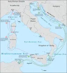 - Mapa de origem com bordas de Arquivo:Mapa da Itália em 1300 (simplificado)-NL.svg, informações de John E. Dotson (1999). "Operações da Frota na Primeira Guerra Genovesa-Veneziana, 1264-1266". Viator. Estudos Medievais e Renascentistas . Vol. 30, pp. 165–180