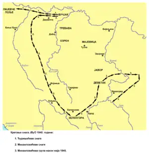 No dia 13 de abril, os Chetniks de Mihailović iniciaram a sua marcha, mas, em vez de seguirem em direção ao curso inferior do rio Drina, onde era impossível atravessar o rio sem barcos nesta época do ano, seguiram para oeste ao longo da margem oriental do rio Sava, até se aproximarem da foz do rio Vrbas. Este curso deveria induzir em erro unidades do Exército Iugoslavo, fazendo-as pensar que os Chetniks se dirigiam para a Eslovênia. [4] O plano de Mihailović não funcionou, pois os movimentos das suas forças foram monitorados meticulosamente por unidades do Exército Iugoslavo. Em 15 de abril, as forças de Mihailović chegaram à área ao redor de Bosanski Brod e Derventa. O grupo subitamente virou para sul e sudeste através das montanhas, até um ponto a leste de Konjic no Neretva, depois para sudeste na direção de Kalinovik e Zelengora e para leste, novamente em direção a Drina, até o ponto perto da aldeia de Brody, onde foi possível atravessar o rio sem dificuldade. Ao longo do caminho, os Chetniks travaram escaramuças com o HOS, e chegaram à região de Fojnica em 19 de abril.
