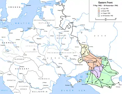 ![]() As ofensivas alemãs em 1943 na região do Cáucaso. | |||