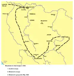 Ao deixar Montenegro, em janeiro de 1945, as unidades Chetnik foram transformadas em divisões e regimentos. Os Chetniks montenegrinos foram organizados na 1ª, 5ª e 8ª Divisões, cada uma com dois regimentos, e no Regimento Juvenil independente e no Batalhão de Estado-Maior. O Corpo Mileševa de Sandžak, liderado por Vuk Kalaitović, não foi reformado e permaneceu uma unidade independente. A 1ª Divisão contava com 2.000 soldados, a 5ª Divisão 2.400, a 8ª Divisão 2.200, o Batalhão de Estado-Maior 600, o Regimento Juvenil 300, a Escolta Pessoal, Segurança e Logística de Đurišić tinha 800, enquanto o Corpo de exército Mileševa tinha 400. [27] O Corpo Drina de Baja Nikić esteve com Đurišić desde 1943. [28] Em março de 1945, esta força foi reforçada com o Corpo Romanija e Chetniks da Herzegovina, bem como elementos de três Corpos da Sérvia: o Corpo Mlava, liderado pelo Capitão Jagoš Živković, o Corpo Kosovo, liderado pelo Major General Blažo Brajović, e o Corpo Rudnik Corps, comandado pelo Capitão Dragomir Topalović "Gaga". [7] Uma parte do Corpo de Mileševa, cerca de 200 homens, separou-se do grupo principal que regressou a Sandžak e permaneceu com Đurišić. [19] O Corpo da Bósnia Média chegou na parte final da batalha. [29]