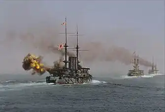 ![]() Shikishima, Fuji, Asahi e Mikasa durante a batalha | |||
