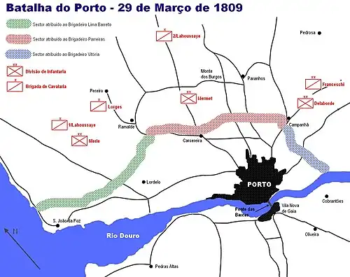 Na cidade do Porto tinha sido construída uma linha defensiva que ia do Forte de São João Baptista da Foz até à capela do Bonfim[7]. Desde o início da invasão, toda a população trabalhou na obra de fortificação, sob a direcção de oficiais de engenharia britânicos e portugueses. A linha de colinas, que a Norte da cidade se situavam a menos de 1Km das habitações limítrofes, foi fortificada com 12 redutos[8] guarnecidos com artilharia de posição. As depressões entre os redutos foram fechadas com paliçadas e abatises. Mais a Oeste, onde a linha de colinas é menos acentuada, a frente foi continuada por um fosso fundo, fortificação de edifícios e quatro redutos. Esta linha terminava nas muralhas do forte de São João da Foz. Este forte ligava-se ainda, em direcção a Norte, ao Castelo do Queijo. Existiam quase 200 bocas de fogo de vários calibres distribuídas por toda a frente. As principais ruas foram barricadas, para servirem de segunda linha de defesa, e a Sul do Douro, no terreno do Convento da Serra do Pilar, foi colocada uma bateria que dominava a ponte e toda a cidade. A ligação com a margem Sul era feita através da ponte das barcas, que tinha um comprimento de quase 200 m.