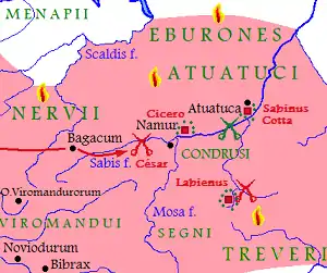 Enquanto César atacava os menápios, Labieno deixou seu acampamento com uma guarnição de cinco coortes e, com as 25 restantes e mais a cavalaria, atacou os tréveros antes que eles pudessem atacar.[carece de fontes]