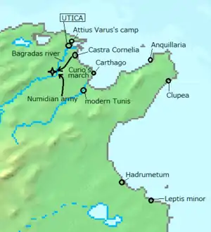 Ocupado em enfrentar as forças de Pompeu, Júlio César enviou, em 49 a.C., uma força para o norte da África, sob o comando de Caio Escribônio Curião, com a missão de enfrentar as forças pompeianas na região[1]. Confiante em suas forças e desdenhoso do governador da África, Públio Ácio Varo, Curião levou consigo menos legiões do que poderia, deixando outras duas na Sicília[2]. Depois de levar a melhor sobre os aliados númidas de Varo em uma sequência de escaramuças, Curião derrotou Varo na Batalha de Útica, obrigando-o a se refugiar na cidade de Útica. Na confusão da batalha, Curião foi aconselhado a tomar a cidade antes que Varo pudesse reagrupar suas forças, mas ele preferiu recuar por acreditar não ter consigo os meios necessários para um assalto a uma cidade fortificada[3]. No dia seguinte, porém, as forças de Curião começaram a cercar Útica com uma contravalação numa tentativa de tomar a cidade através da fome. As lideranças da cidade se reuniram com Varo e imploraram para que ele se rendesse, poupando a cidade dos horrores de um cerco[3]. Contudo, Varo soube que o rei Juba I estava a caminho com um grande exército e assegurou-os de que, com a ajuda de Juba, Curião seria logo derrotado[3]. Curião também soube que o exército de Juba estava próximo e resolveu abandonar o cerco para abrigar seu exército em Castra Cornélia[4].