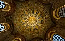 O centro da cúpula é ocupado por um mosaico que representa João Batista batizando um Jesus Cristo com barba em pé com água até a cintura no rio Jordão, que é mostrado nos véus. A um lado está um deus pagão das águas com um junco numa mão e uma prenda de roupa na outra, representando o rio Jordão. Mais embaixo e em torno da cena do batismo de Cristo é representada uma procissão dos doze apóstolos em duas direções, acabando com São Pedro encontrando-se com São Paulo.