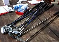 O equipamento usado consiste num clássico taco de golfe, uma bola expandida e uma faixa de proteção.