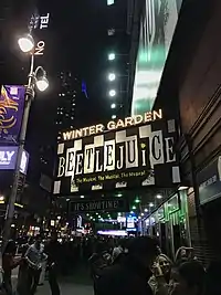 Beetlejuice é um musical baseado no filme de 1988 de mesmo nome, com música por Eddie Perfect e libreto de Scott Brown e Anthony King. O musical foi indicado à oito Tony Awards, incluindo o de Melhor Musical. Antes de estrear na Broadway, passou por um período de testes no National Theatre, Washington, DC em outubro de 2018. Começou suas prévias na Broadway em 28 de março de 2019 no Winter Garden Theatre em Nova Iorque e em 25 de abril de 2019 estreou oficialmente. É produzido pela Warner Bros. Theatre Ventures. O musical estava previsto para ter sua última apresentação em 6 de junho de 2020, porém devido à pandemia de COVID-19, o show teve sua última apresentação[1] na Broadway em 11 de março de 2020.