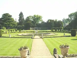 Em 1690, foi concedida a Sir John Brownlow permissão para encerrar uma área de 1000 acres (4 km²) para transformá-la num parque, com autorização para guardar veados. Existem evidências que sugerem que alguma desta área já era um parque desde, pelo menos, 1580. O parque foi traçado com avenidas, incluindo a ainda sobrevivente Avenida Este, a qual conduz para leste a partir do palácio. Brownlow também mandou fazer um grande lago e plantou 21.400 freixos, 9.500 carvalhos e 614 árvores de fruta. Pensa-se que William Winde pode ter dado conselhos no esboço dos jardins.[23] Proóximo do edifício ficava uma série de jardins mais formais, incluindo canais de água, cercados por plantações contendo passeios simétricos, lembrando as faixas redondas indroduzidas pelo jardineiro paisagista André Le Nôtre.