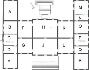 O hall da entrada principal, os quartos de hospedes e quartos familiares estão situados no primeiro andar, sobre uma cave que compreende as salas de serviço. As duas entradas principais do palácio, no centro das fachadas Norte e Sul, foram acedidas por escadarias exteriores, originalmente com um amplo tramo único no lado Norte e uma escaldaria dupla no lado Sul. Estas escadarias foram substituídas por um desenho mais simples ilustrado na planta acima.