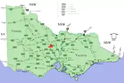 Localização de Bendigo (em vermelho) no estado de Vitória