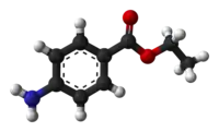 A benzocaína é o p-aminobenzoato de etila, um éster etílico do ácido p-aminobenzoico (PABA). Também é um anestésico local, usado como calmante para dores que atua bloqueando a condução de impulsos nervosos e diminuindo a permeabilidade da membrana neuronal ao iodeto de sódio.