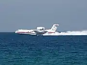 ![]() Beriev Be-200 abastecendo seus tanques com água no Mar Mediterrâneo, em operação durante um incêndio no Monte Carmelo em Israel. |
