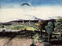 ![]() Do topo: Torre do Portão; rua de comércio; Prefeitura; igreja de São Pedro e São Paulo; castelo com torre; panorama e caixa d'água | ||||