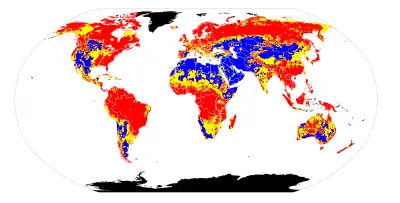 Vermelho = solos ácidos. Amarelo = Solos neutros (próximo de pH 7) Azul = solos alcalinos. Negro= sem dados.