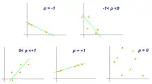 O Coeficiente de correlação de Pearson é uma medida de associação entre duas variáveis, X e Y . Este coeficiente, normalmente representado por ρ (rho) para a população e r para a amostra, assume valores entre -1 e 1, onde ρ = 1 representa uma correlação positiva perfeita, ρ = −1 representa uma correlação negativa perfeita e ρ = 0 significa não existir nenhuma correlação linear.[11]