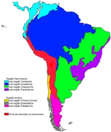 - Sub-região Brasílica: Parte tropical da América do Sul. Segue em direção ao leste até a cordilheira dos Andes e em direção ao sul,compreendendo Argentina até uma linha irregular que vai desde a bacia endorreica do Chasicó e Bahia Blanca ao sul de Córdoba, sul de San Luis e laguna Diamante em Mendoza.