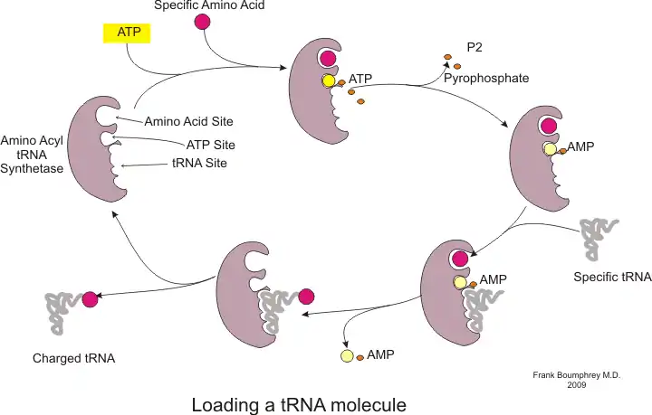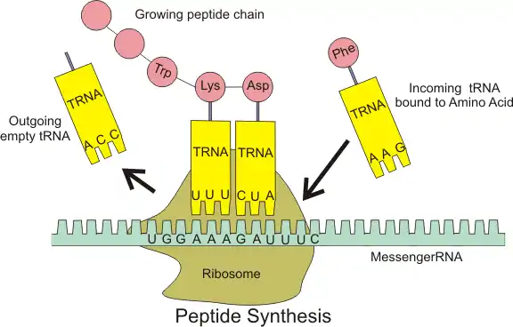 Além de se ligar a um aminoácido, o ARNt tem uma unidade de três nucleotídeos chamada anticódon que se emparelha com tripletos de nucleotídeos específicos no ARNm chamado códons; os códons codificam um aminoácido específico.[56] Essa interação é possibilitada pelo ribossomo, que funciona como local para a síntese de proteínas. O ribossomo tem três sítios de ligação para ARNt: o sítio aminoacilo (sítio A), o sítio peptidilo (sítio P) e o sítio de saída (sítio E).[57]