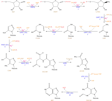 - GAR sintetase[16] realiza a condensação de glicina ativada en PRPP, formando ribonucleotídeo de glicinamida (GAR).
