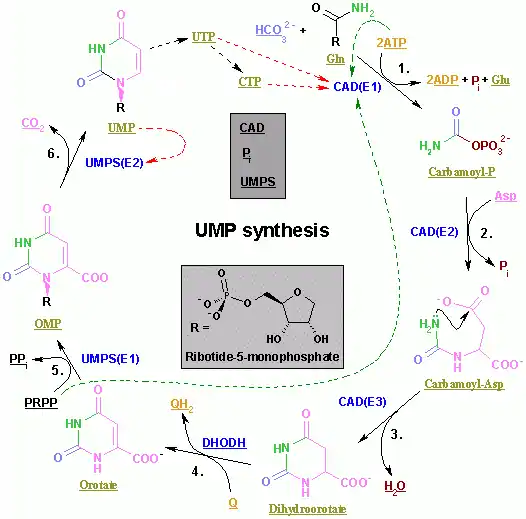- A OMP decarboxilase catalisa la conversão de orotidina-5'-fosfato em UMP.[21]