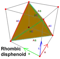 - Um cristal com formato de cunha tetragonal ou sistema ortorômbico. Ele tem quatro faces triangulares que são iguais e que correspondem a posição das faces alternativas do tetragonal ou bipirâmide ortorômbico . Ele é simétrico sobre cada um dos três mutuamente perpendiculares eixos diad de simetria em todas as classes, exceto a bifenoidal tetragonal, na qual o formulário é gerado por um eixo de simetria tetrad inverso.