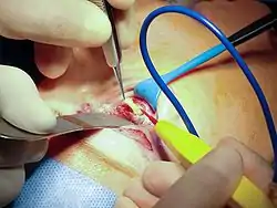 Na blefaroplastia superior, remove-se, do centro de cada pálpebra superior, uma dobra horizontal de pele, de modo a que a cicatriz corra ao longo de uma prega natural.[2] Na blefaroplastia inferior, a incisão é feita abaixo das pestanas, de modo a que a cicatriz fique na zona de sombra das mesmas e se prolongue obliquamente, de modo a parecer uma ruga de expressão.